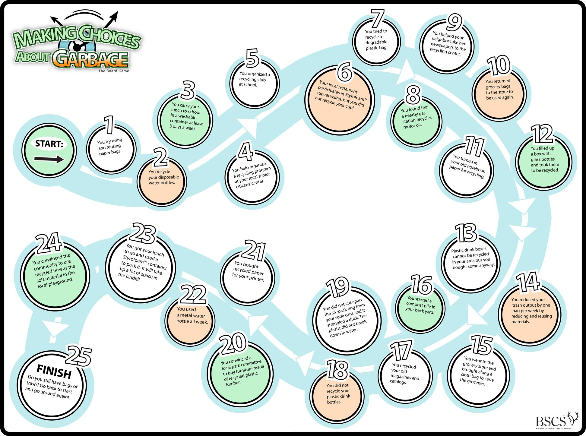 Figure 1-10: The Making Choices about Garbage game board. Discuss each of the spots on the game board with your team. Each spot describes an action that will either increase or decrease the amount of garbage produced. You will decide how much the action will affect garbage production. -